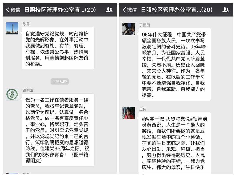 “95年风云激荡,95载辉煌历程,我们党始终引领着中华民族的复兴之路。作为一名党员,我将坚定理想信念,把做一名合格党员作为一生最高的追求。真诚祝愿伟大的党永葆青春,我们的祖国繁荣昌盛!”7月1日上午,在日照校区管理办公室直属党支部开展的“两学一做·我想对党说”主题党日活动上,日照校区管理办公室赵梦同志在直属党支部微信群里对党说了以上心里话。