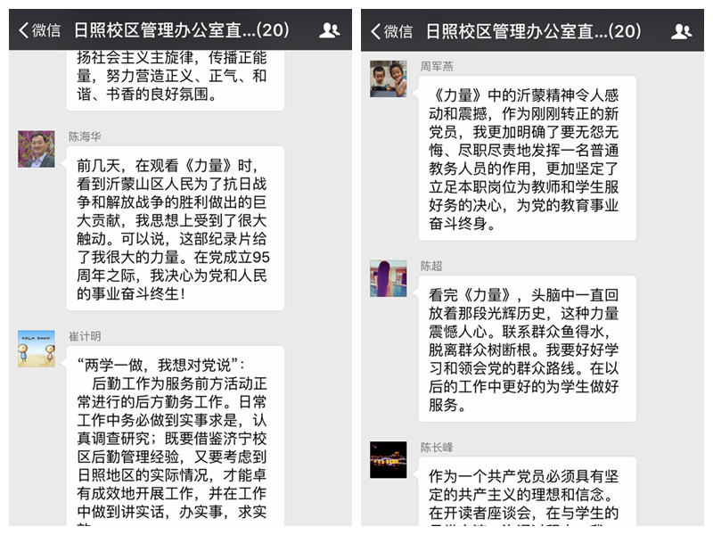 刚刚转正的教务处周军燕同志,还结合直属党支部组织观看的专题纪录片《力量》说道:“《力量》中的沂蒙精神令人感动和震撼,作为刚刚转正的新党员,我更加明确了要无怨无悔、尽职尽责地发挥一名普通教务人员的作用,更加坚定了立足本职岗位为教师和学生服好务的决心,为党的教育事业奋斗终身。”