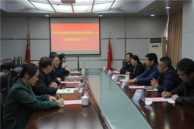 井西学介绍了潍坊医学院的相关情况,回顾了两校的交往历程,并预祝两校各项工作取得新进展。双方就英语(跨境电商方向)专业建设、校企合作办学、学科发展等方面进行了交流。